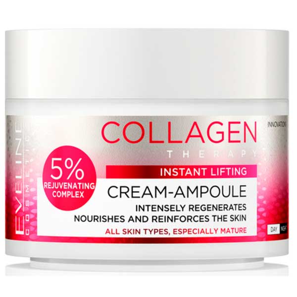 Eveline Collagen Therapy Instant Lifting Cream-Ampoule rejuvenece y regenera la piel madura al instante gracias a su combinación de Colágeno y un exclusivo complejo rejuvenecedor al 5 % aportándole además hidratación y luminosidad. Recomendamos aplicar por la mañana y por la noche masajeando sobre la piel limpia y seca.