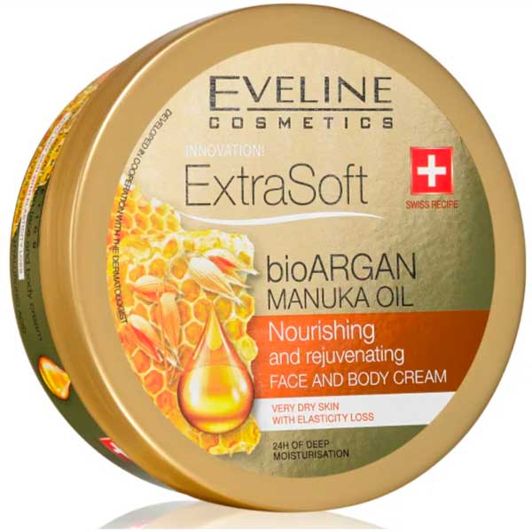 Eveline Extra Soft bioArgán Aceite de Manuka Crema para Rostro y Cuerpo es una crema diseñada para regenerar. nutrir e hidratar intensamente la piel seca o muy seca a la vez que estimula la regeneración celular gracias a su contenido en bioargán y aceite de Manuka.