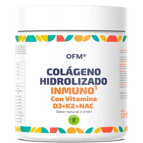 Doctora Odile Fernández Colágeno Hidrolizado Inmuno OFM es un suplemento que mejora la salud de piel, pelo, articulaciones, huesos y uñas además de reforzar el sistema inmune. Su fórmula exclusiva se compone de Colágeno bovino hidrolizado reforzado con Ácido Hialurónico, Vitamina D, N Acetil Cisteína, Enzimas digestivas, Biotina, Hierro liposomado y Magnesio. Esta combinación consigue mejorar la salud articular y ósea y la salud de cabello, piel y uñas. Mejora la función inmunológica y antioxidante así como la digestión y la absorción de nutrientes. Potencia la energía y mejora el metabolismo a la vez que promueve la salud cardiovascular, integral y la longevidad. Sin gluten, sin lactosa, sin azúcar y sin aditivos. Recomendamos tomar un cazo al día mezclado con líquido o yogur. Se aconseja una ingesta continuada durante al menos periodos de tres meses. Descansar 4 semanas después de cada ciclo de 6 meses.